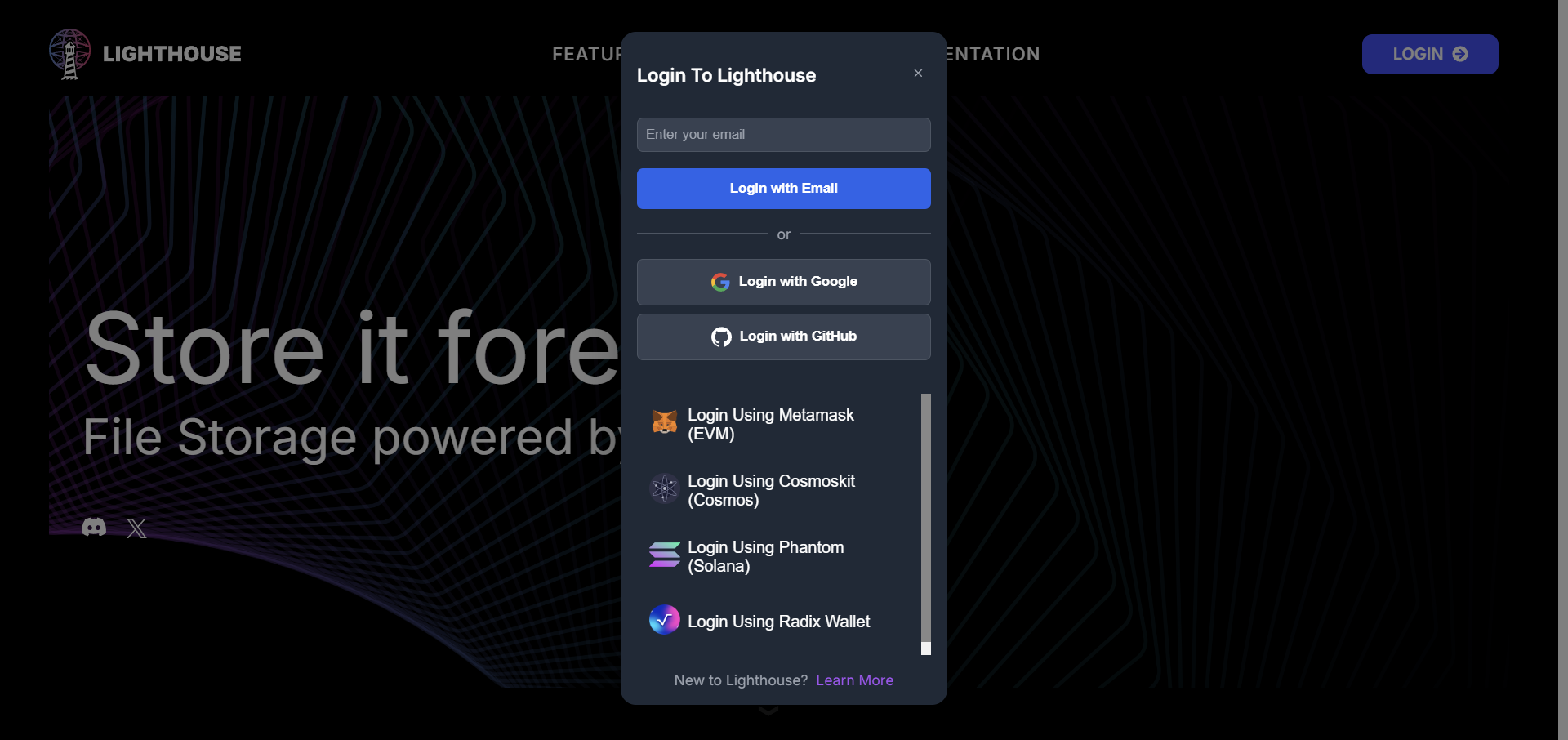 The Login Dialog on files.lighthouse.storage now supports the use of Radix Wallet for user authentication, alongside other supported wallets.
